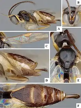 Мелкие паразитические наездники. От близких родов отличается субтреугольным ареолетом, средней длиной яйцеклада (он толстый, часто апикально изогнут кверху), его длина примерно вдвое меньше длины задней голени, волоски в основном на апикальной его половине. Первый тергит в 2-3 раза длиннее своей ширины, немного расширен на вершине и обычно сжатый между основанием и серединой. 2-й тергит субтреугольный. Жгутик усика 16-члениковый. Нижнечелюстные щупики 5-члениковые, нижнегубные щупики состоят из 3 сегментов. Дыхальца первого брюшного тергиты находятся на латеротергитах. Паразитируют на гусеницах бабочек[1][2][3].