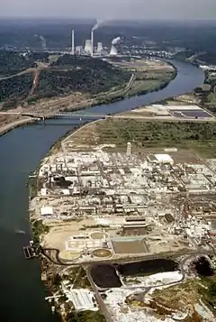 - Белый фосфор для снаряжения фосфорных боеприпасов поставлялся «Монсанто» на склады УХВ с апреля 1943 по апрель 1946 года с Дакриверского химического завода. При производстве белого фосфора, в целях оптимизации бюджетных расходов, подрядчики подбирались по соответствию двум условиям: во-первых, географической близости к залежам фосфатных руд, во-вторых, наличия дешёвых источников электроэнергии, что и предопределило выбор «Монсанто» в качестве подрядчика, с завода которого оснащались белым фосфором три арсенала УХВ;[26]