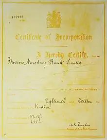 В 1919 году ввиду нарушения связей с материнским учреждением, вызванного национализацией в России, было решено защитить право лондонского отделения банка на существование и зарегистрировать его как британское юридическое лицо. Руководители банка Жан Бубнов и Константин Попов подали заявление на его регистрацию в качестве английской компании с ограниченной ответственностью, которая была зарегистрирована в Лондоне 18 октября 1919 года как компания Англии и Уэльса под номером 159752 с названием Moscow Narodny Bank Limited и акционерным капиталом 250 тысяч фунтов стерлингов. Первоначальный состав акционеров: Московский Народный Банк, Центросоюз, Центральное объединение льноводов, Сельскосоюз и Закупсбыт. Основное назначение банка заключалось в финансировании внешней торговли российских кооперативных организаций с Великобританией и другими странами.