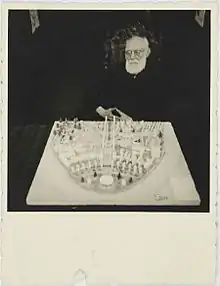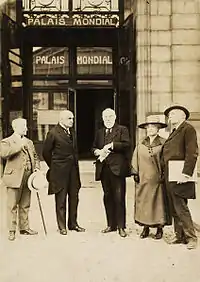 ![]() Поль Отле и Анри Лафонтен со своей женой перед входом в дворец Mondial в Брюсселе | |