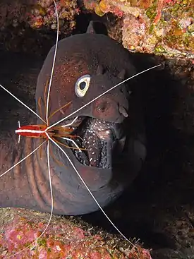 ![]() Мурена позволяет креветке Lysmata grabhami чистить себе зубы | ||||||