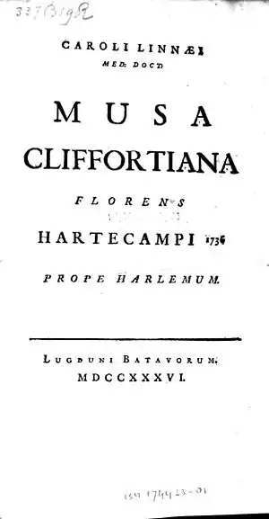 Первое и единственное издание вышло в Лейдене в 1736 году под названием Musa Cliffortiana florens Hartecampi[2]. Появление работы стало поводом для серьёзного спора в 1737 году в первом немецком научном журнале «Acta eruditorum»[3].