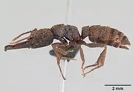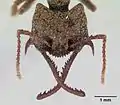 Среднего размера муравьи с широкой субквадратной головой и длинными зазубренными челюстями, прикреплёнными у боковых краёв передней части клипеуса. На переднем крае наличника 9 зубцов. Основная окраска тела буровато-чёрная. Промеры голотипа (рабочий муравей): длина головы (HL) — 2,46 мм, ширина головы (HW) — 2,72 мм, отношение ширины головы к её длине (HW/HL x 100 = CI) — 111, длина скапуса (SL) — 1,84 мм, индекс скапуса (отношение длины скапуса к ширине головы; SI) — 68, длина мандибул (ML) — 2,81 мм, длина груди (WL) — 2,73 мм. Максиллярные щупики состоят из 4 члеников, а нижнегубные из 3 сегментов. Матки и самцы неизвестны. Вид был впервые описан в 2007 году и назван в честь Dr. Maren Scheidhauer[1][2].