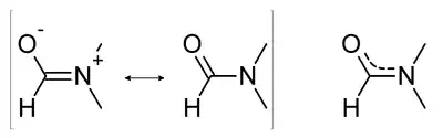 Благодаря наличию двух резонансных форм в диметилформамиде порядок связи С=O уменьшен, а С-N увеличен. Так в инфракрасном спектре наблюдается понижение частоты карбонильной группы (1675 см−1) по сравнению с таковой для свободной. Также благодаря частично двойному характеру связи азот-углерод, при комнатной температуре заторможено вращение вокруг неё в шкале времени ПМР. При этом наблюдается два сигнала (синглеты) метильной группы интенсивностью 3 протона δ 2.97 и 2.88, вместо одного синглета 6 протонов.