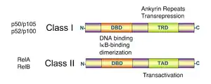 У млекопитающих обнаружено 5 членов семейства NF-κB/Rel, которые делятся на 2 класса[2]: