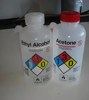 | 3 | Жидкости и твёрдые вещества, способные воспламеняться почти при температуре внешней среды. Температура вспышки между 23 °C (73 °F) и 38 °C (100 °F) (например, бутанол-1, бензол, ацетон) |