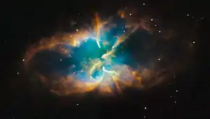 Туманность является следствием колоссального взрыва звезды, сбросившей собственную оболочку во внешнее пространство. Горячее звёздное ядро в виде белого карлика, оставшееся после взрыва, теперь будет остывать в течение миллионов лет. Подобное событие ждёт и наше Солнце приблизительно через 5 миллиардов лет. В ноябре 2008 года орбитальный телескоп Хаббл сделал снимки туманности беспрецедентного качества[2], красные цвета на них указывают на наличие азота, зелёные — на наличие водорода, а синие — на наличие кислорода.