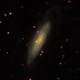 Галактика сильно наклонена к картинной плоскости, имеет удлинённое ядро и пыльные зернистые спиральные рукава. К востоку от ядра на фоне галактики видна тусклая звезда поля или, возможно, конденсация в само́й галактике[5].