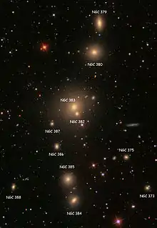 Есть ещё четыре близлежащие галактики NGC 379, NGC 380, NGC 385 и NGC 384, которые предположительно тесно связаны с NGC 383, а также несколько других галактик на относительно близком расстоянии.