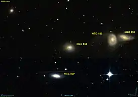 Галактика NGC 838 входит в состав группы галактик NGC 835. Помимо NGC 838 в группу также входят NGC 833, NGC 835, NGC 839, NGC 848, NGC 873 и MGC -2-6-19.