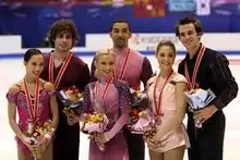 Подиум в танцах на льду: Тесса Вертью и Скотт Моир (2), Изабель Делобель и Оливье Шонфельдер (1), Яна Хохлова и Сергей Новицкий (3-е место).