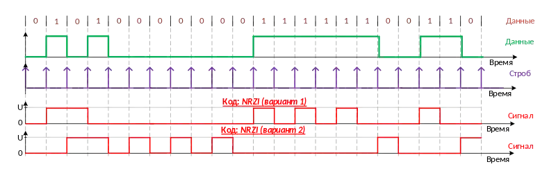 Различают следующие варианты формирования сигнала в соответствие с кодом NRZI: