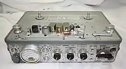- 1958 год. Nagra III — первый магнитофон Nagra с электродвигателем постоянного тока вместо патефонного привода[1]. Разработчики полностью отказались от радиоламп, заменив их транзисторами, что позволило даже с электродвигателем обходиться питанием от 12 элементов типа D. Характеристики звукового тракта позволяли записывать на скорости 38,1 сантиметра в секунду частотный диапазон от 25 герц до 20 килогерц[4]. Некоторые модификации аппарата были пригодны для синхронной записи методом связи с кинокамерой при помощи пилот-тона;