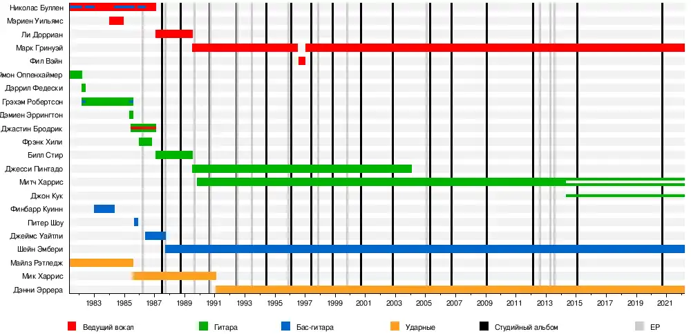 - Шейн Эмбёри — бас-гитара (1987 — настоящее время)