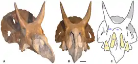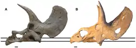 Аутапоморфии включают редуцированный носовой рог, почти неотличимый от носовой кости, надбровные рога, обращённые вверх (под прямым углом к линии челюсти), и очень маленькие окна в теменной кости[2].