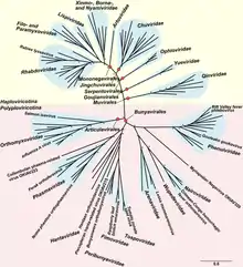 Филогенетический анализ основанный на последовательности RdRp, показывает, что оц(-)РНК-вирусы произошли от общего предка, и что они, вероятно, являются сестринской кладой по отношению к реовирусам, которые являются вирусами с двухцепочечной РНК. Внутри этого типа есть две чёткие ветви, относящиеся к двум подтипам, в зависимости от того, синтезирует ли RdRp кэп на вирусной мРНК или осуществляет отрыв кэпа от мРНК клетки-хозяина и присоединяет его к мРНК вируса[3][4].