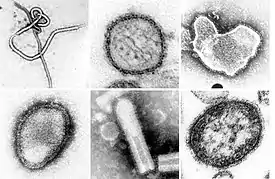 ![]() Микрофотографии некоторых вирусов из типа Negarnaviricota, полученные с помощью просвечивающего электронного микроскопа. Не в масштабе. Слева направо, сверху вниз: эболавирус Заир, вирус Син Номбре, респираторно-синцитиальный вирус человека, вирус Хендра, неидентифицированные рабдовирусы, вирус кори | ||||||