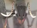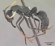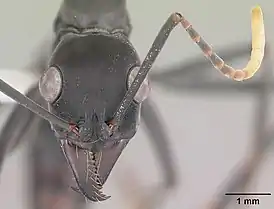 Среднего размера муравьи (около 1 см) с крупными многозубчатыми жвалами. Основная окраска чёрная; концевая часть усиков желтоватая. Голова, грудь и брюшко чёрные. Скапус усиков длинный, чёрный. Глаза большие выпуклые, расположены в среднебоковой части головы. Жало развито. Стебелёк между грудкой и брюшком одночлениковый, состоит из петиоля[1][2].