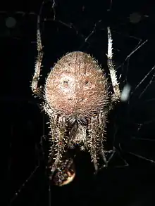 ![]() Neoscona crucifera на паутине, вид снизу | ||||||||||