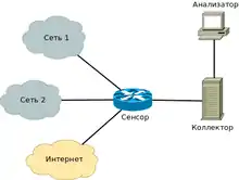 - Сенсор. Собирает статистику по проходящему через него трафику. Обычно это L3-коммутатор или маршрутизатор, хотя можно использовать и отдельно стоящие сенсоры, получающие данные путём зеркалирования порта коммутатора.