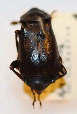 Длина тела 18-21 мм. Переднеспинка округлая, с хорошо выраженными полями. Надкрылья более узкие, чем переднеспинка, их окраска одноцветная черная или буровато-чёрная. Булава усиков овальная, одноцветная чёрная либо тёмно-бурая. Плечи покрыты в торчащих редких чёрных волосках. Эпиплевры надкрылий или вовсе лишены волосков или имеют редкие желтоватые волоски. Заднегрудь, бока и вершины стернитов брюшка, пигидий, средние и задние бедра покрыты густыми жёлто-бурыми волосками.