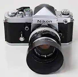 Разные модификации серийного Nikon F2 отличаются только сменными пентапризмами, иногда называемыми «головками»[* 6]. В базовую комплектацию входит видоискатель типа DE-1, не оснащённый экспонометром[29][30][31]. В отличие от других пентапризм чёрного цвета, эта выпускалась также в хромированном исполнении вплоть до снятия с производства всей линейки F2. В настоящее время призма DE-1 встречается редко и пользуется спросом у коллекционеров, как «классическая»[32].