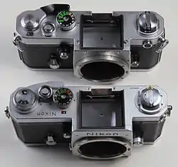 Полностью металлический корпус отличается от предшествующей модели откидной задней стенкой на съёмном шарнире[3]. Съёмная задняя крышка Nikon F изготавливалась заодно с нижним основанием, как у большинства дальномерных камер. Несмотря на преимущества совместимости с двухцилиндровыми шторными кассетами типа «Contax», такая крышка снижала оперативность съёмки из-за неудобства перезарядки. Кроме того, моторный привод модели F конструктивно выполнялся как одно целое с крышкой, что заставляло при перезарядке плёнки снимать его вместе с батарейным блоком[22]. В F2 от такой конструкции отказались, и фотоаппарат приобрёл вид, привычный для следующих десятилетий: моторы присоединяются снизу фотоаппарата и не мешают перезарядке[23]. Крышка заменяется магазинами на 250 или 750 кадров плёнки, задниками с функцией впечатывания даты, и даже специальной приставкой для моментальной фотографии по технологии Polaroid[24].