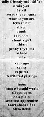Менее чем через две недели Nirvana выступила на MTV Video Music Awards[35]. Руководство MTV хотело, чтобы группа сыграла «Smells Like Teen Spirit», но музыканты пожелали исполнить новую песню, которая называлась «Rape Me» (рус. Изнасилуй меня). Руководители MTV были недовольны песней, так как, по словам продюсера шоу Эми Финнерти, они решили, что в тексте речь идёт о них. Они настояли на том, что Nirvana не будет играть «Rape Me», пригрозив, что не дадут группе выступить на шоу и перестанут показывать их клипы по MTV. После напряжённых споров MTV и Nirvana договорились, что группа сыграет песню «Lithium» с последнего на тот момент сингла[36]. Когда Nirvana начала выступление, Курт неожиданно сыграл и спел начало из «Rape Me», после чего заиграла «Lithium». Ближе к концу песни Новоселич, недовольный тем, что его усилитель перестал работать, подкинул бас-гитару в воздух для драматического эффекта, но не смог её поймать, и она ударила его по голове. Крист упал со сцены, чуть не потеряв сознание, потом поднялся и выбежал из студии[37]. В это время Кобейн разбивал аппаратуру, а Грол схватил микрофон и начал кричать: «Эй, Эксл!» (англ. Hi, Axl!), имея в виду вокалиста группы Guns N' Roses Эксла Роуза, с которым у Nirvana вышла небольшая размолвка перед выступлением[38].