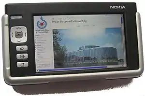 Nokia 770 Internet Tablet — карманный компьютер от компании Nokia («интернет-планшет» по классификации Nokia), анонсированный на LinuxWorld Summit в Нью-Йорке 25 мая 2005 года.[1] Устройство предназначено для использования беспроводного Интернета, просмотра электронной почты. Текстовое и голосовое (VoIP) общение через Интернет возможно с помощью предустановленных приложений Chat и Internet Call, поддерживающих сервисы Google Talk и Jabber, а также с помощью дополнительно устанавливаемого клиента для VoIP-сервиса Gizmo5. Предустановлены приложения для Интернет-радио, чтения RSS, просмотра изображений и документов в формате PDF и др. С помощью сторонних утилит возможно использование miniUSB-порта планшета в режиме USB-host, а также расширение функциональности модуля Bluetooth, в частности, подключение к планшету беспроводной клавиатуры, поддерживающей стандартный профиль HID (например, Nokia SU-8W) и внешнего GPS-навигатора.