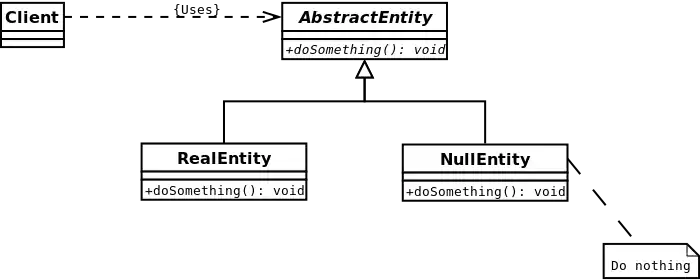 - Объект требует взаимодействия с другими объектами. Null Object не устанавливает нового взаимодействия — он использует уже установленное взаимодействие.