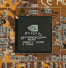 История семейства графических процессоров GeForce (название которых было сложено из слов geometry (англ. геометрия) и force (англ. сила) и содержит игру слов за счёт созвучия с g-force (англ. ускорение свободного падения)) началась в 1999 году с выходом GeForce 256 на чипе NV10[31]. Компания позиционировала его как первый графический процессор — впервые все блоки обработки графики были размещены в одном кристалле. Главным нововведением стал блок T&L, который ввёл аппаратную поддержку трансформации вершин 3D объектов (изменения положения и масштаба), отсечений (clipping) и освещения: ранее эти задачи выполнялись на центральном процессоре[32]. В целом на потребительском рынке технология получила распространение позднее, а в 1999 году наработки были использованы в профессиональных видеокартах Quadro. GeForce 256 поддерживала OpenGL 1.3 и стала первой картой с полной поддержкой Direct3D 7. В 2000 году компания выпустила усовершенствованный чип NV15 на более тонком техпроцессе и с увеличенной на 40 % производительностью, большим числом конвейеров обработки данных и улучшенным T&L, а также упрощённые NV11 и NV16, работавшие на более высокой тактовой частоте. Основанные на них карты выходили под брендом GeForce 2. Тогда же выпущен графический процессор GeForce Go со сниженным энергопотреблением, предназначенный для использования в ноутбуках. В это время в конкуренцию вступила канадская компания ATI, представившая чипы R100 и R200 и мобильный чип RV200. Рыночный успех Nvidia и ATI подорвал позиции 3dfx Interactive, которая в попытке превзойти конкурентов вложилась в разработку провальной многопроцессорной Voodoo 5 6000, что вкупе с плохими продажами Voodoo 4 подорвало финансовую устойчивость компании и привело к её банкротству. В результате Nvidia приобрела большую часть активов 3dfx, и в её штат перешло большинство инженеров конкурента[14][33][34].