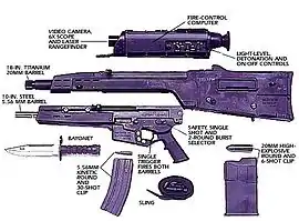 ![]() OICW в разобранном виде: сверху вниз — модуль управления огнём, HE-модуль, KE-модуль; внизу слева направо — штык, винтовочный магазин с патроном, ремень и гранатомётный магазин с гранатой | |