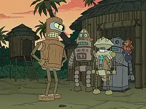 Шторм выносит его на тропический остров. Бендер не может ни построить себе убежище, ни добыть пищи, и очень скоро у него садится аккумулятор. Его спасают аборигены — такие же роботы, но использующие альтернативные (несовременные) источники питания. Очень скоро Бендер проникается их жизнью, принимает их стиль существования и даже делает себе даунгрейд — заменяет металлические части своей конструкции на аналогичные деревянные. Он призывает всех на борьбу с современными технологиями.