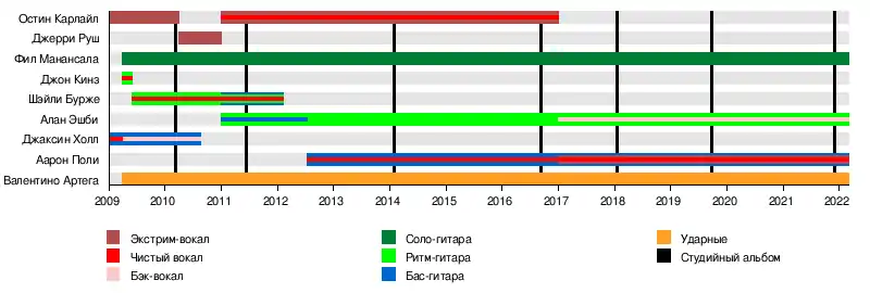 - Аарон Поли — бас-гитара, чистый вокал (с 2012), экстрим-вокал (с 2017)