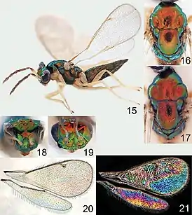 ![]() Наездник Omphale admirabilis: 15 — сбоку, 16 и 17 — грудь сверху, 18 и 19 — голова спереди, 20 и 21 — крылья. 15, 16, 18 и 21 — самка; 17, 19 и 20 — самец. | ||||||||||||||||||