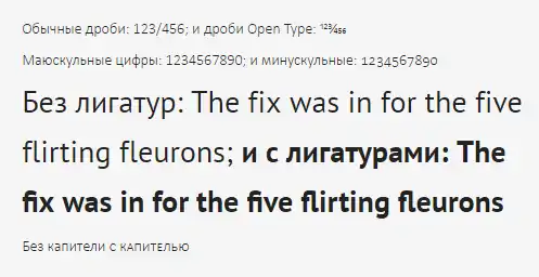 - Улучшенная типографика: шрифты OpenType могут включать широкий набор глифов, включая лигатуры, дроби, исторические символы (числа старого стиля, капительные символы) и другие. Они допускают автоматическую замену определённых символов на них.