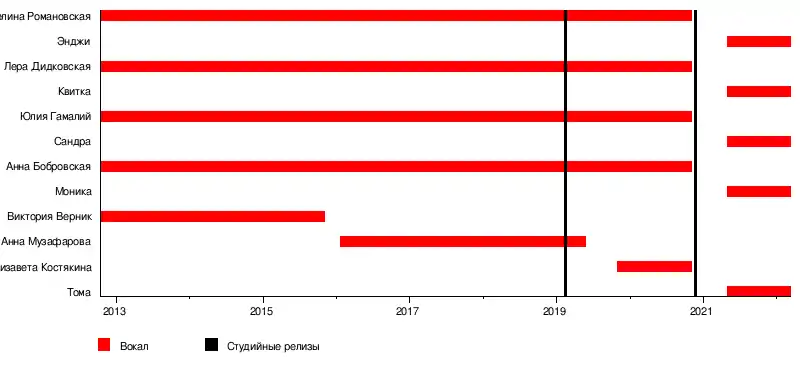 - Ангелина Романовская — род. 22 декабря 2000 (21 год) (2012—2020)