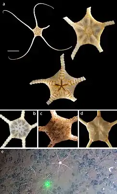 Морские иглокожие. Диск пятиугольный; плоский (на уровне рук-лучей). Дорсальный диск без гранул; с первичными пластинами; без шипов, но с чешуей. Пластина спинного диска без бугорков. Форма лучей неразветвленная; длина более 3-4-кр. диаметра диска; покрытие без гранул/шипов/бугорков. Гребни лучей отсутствуют. Дорсальная пластина лучей развита. Дополнительная дорсальная пластина лучей отсутствует. Имеется вентральная пластина руки[1].
