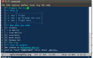 Главная страница Org-mode гласит, что «по своей сути, org-mode — простой планировщик для заметок и управления списками».[7] Автор Доминик Карстен объясняет, что «Org-mode делает древовидные списки, заметки, гиперссылки, таблицы, списки TODO, планирование проектов, GTD, HTML и LaTeX разметку, всё с обычными текстовыми файлами в Emacs.»[8]