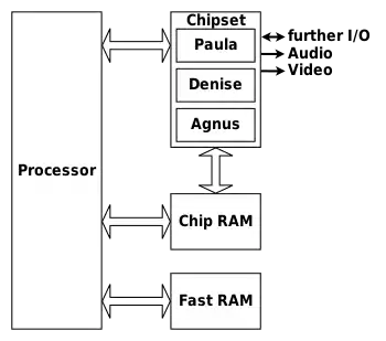 - Paula — Прежде всего выполняет функции процессора звука c 4 независимыми и аппаратно микшируемыми 8-битными PCM-каналами стерео-звука. Обеспечивает 65 уровней громкости и аппаратную поддержку воспроизведения инструментов с любой частотой дискретизации в диапазоне от 20 Гц до 29 кГц. Фактически, Paula может обеспечивать 14-битный стереозвук (за счёт использования дополнительного бита громкости, имеется программная поддержка в приложениях для студийной обработки звука на Amiga).