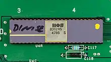 - Denise — Основной видеопроцессор, который (без использования режима Overscan) может отображать 320 (в режиме Lores) или 640 (в режиме Hires) пикселей по горизонтали, при 200 (NTSC) или 256 (PAL) пикселях по вертикали. Поддерживает интерлейсинг, удваивающий вертикальное разрешение. Отображаемые экраны могут использовать от 2 до 32 уникальных цветов (1—5 бит-планов) из 12-битной палитры (4096 цветов). 6-й бит-план используется либо для режима Half-Brite, в котором возможно отображение дополнительных 32 цветов с половинной яркостью относительно основных, либо для режима HAM6, который позволяет одновременно использовать на экране все 4096 цветов из заданной палитры. Помимо этого, Denise поддерживает 8 аппаратных спрайтов, плавное попиксельное скроллирование экрана, отображаемого на монитор и режим Dual Playfield, в котором два одновременно выводимых экрана могут просвечивать один сквозь другой (позднее эта возможность получила название альфа-канала). Также, этот чип обеспечивает поддержку (и синхронизацию, например с аппаратным спрайтом) для аналоговой мыши и цифрового джойстика.