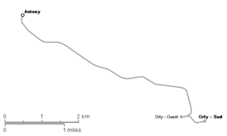 Протяженность линии Orlyval составляет 7,3 км, линия состоит всего из трёх станций: Antony (RER-линия В), Orly-Ouest и Orly-Sud. Длительность поездки между терминалами Орли-Запад и Орли-Юг составляет всего 2 мин, от Западного терминала до Anthony — 6 минут. Всего на линии эксплуатируются 8 поездов, которые отправляются со станций в утренние и вечерние часы в четырёхминутном такте. Orlyval работает ежедневно с 6 до 23 ч.