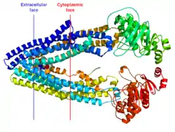 P-гликопротеин — трансмембранный белок, молекулярная масса 170 кДа, включая N-концевое гликозилирование 10-15 кДа. Белок содержит 6 трансмембранных доменов на N-концевой части, крупный цитозольный домен с участком связывания АТФ, затем вновь 6 трансмембранных доменов и второй участок связывания АТФ. Вторая половина белка на 65 % гомологична аминокислотной последовательности первой половине[4]. Структура P-гликопротеина млекопитающих была разрешена в 2009 году[5] на основе гена мыши MDR3, гетерологически экспрессированного в дрожжах Pichia pastoris. Структура P-гликопротеина мыши оказалась сходна по структуре с бактериальным ABC-переносчиком MsbA (3B5W и 3B5X)[6], который принимает конформацию с вогнутой внутрь поверхностью, что считается важным для связывания субстрата на внутренней поверхности мембраны. Кроме этого, дополнительные структуры (3G60 и 3G61) белка обнаружили участки связывания для двух циклических пептидных субстратов/ингибиторов. Участки связывания на молекуле P-гликопротеина выстланы остатками ароматических аминокислот. Молекулярное моделирование подтвердило, что эта последовательность оказывает прямое воздействие на структурную стабильность переносчика в его нуклеотид-связывающих доменах и определяет границу внутренних лиганд-связывающих карманов[7].