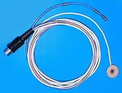 - Накожного хлорсеребряного электрода сравнения, соединённого с электродным проводом. В центре полости электрода находится площадка из хлористого серебра. Её контакт с кожей осуществляется через поролоновую прокладку, пропитанную электродной пастой.