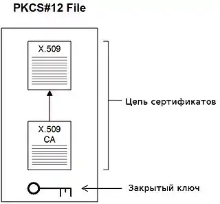 В криптографии PKCS#12 — один из стандартов семейства Public-Key Cryptography Standards (PKCS), опубликованных RSA Laboratories. Он определяет формат файла, используемый для хранения и/или транспортировки закрытого ключа (en:Private key), цепочки доверия от сертификата пользователя до корневого сертификата удостоверяющего центра и списка отзыва сертификатов (CRL). Защита файла осуществляется одним из двух способов: безопасным, с использованием доверенной ключевой пары (открытый/закрытый ключи, подходящие для цифровой подписи и шифрования) или менее безопасным, с использованием симметричного ключа, основанного на пароле. Второй подходит для случаев, когда использование доверенных пар открытый/закрытый ключей недоступны. Формат PKCS#12 — это формат, предназначенный для хранения ключевой пары (закрытый ключ и сертификат), который распознаётся и используется многими браузерами и почтовыми агентами. В файлах PKCS#12 хранятся одновременно и сертификат, и закрытый ключ (разумеется в зашифрованном виде). Примерная организация PKCS#12 файла показана на рисунке справа.