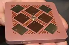 ![]() Многопроцессорный модуль с четырьмя процессорами POWER5 и четырьмя модулями кэш-памяти III уровня по 36 MБ | |