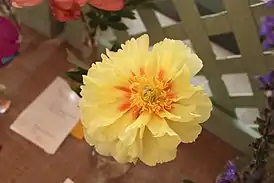 Цветки полумахровые, 15—20 см в диаметре, жёлтые с мягкими красными «вспышками» в центе. Цветки располагаются сбоку и в верхней части куста. Аромат лимонный[1][2][3].