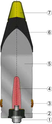 1. Донный взрыватель 5103, 2. Трассёр, 3. Ведущий поясок, 4. Разрывной заряд (desensibilisiert/träge), 5. Стальной корпус, 6. Бронебойный наконечник из мягкой стали, 7. Баллистический наконечник.