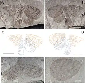 ![]() Paristopsyche angelineae. А-B. Фотографии части голотипа C-D. Чертежи части голотипа; E-F. Фотографии паратипов. Масштабные линии A–E — 5 мм. Масштабная линия F — 1 мм |