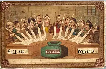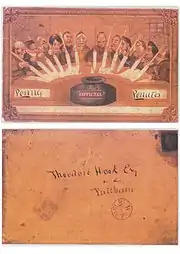В древнеримской религии пенаты были божествами-хранителями и покровителями домашнего очага или кладовых.[3] Теодор Хук вручную изготовил цветную почтовую карточку с карикатурой на почтовых служащих как «хранителей» почтовой связи. Открытка была задумана как забавный розыгрыш[4][5]